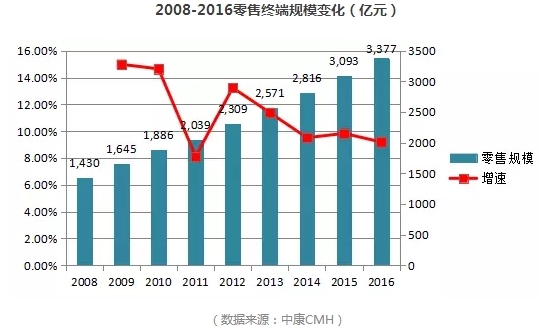 來自中康CMH的數(shù)據(jù)顯示,2008-2016年,零售終端規(guī)模由1430億元增長至3377億元,年平均增長11.3%。同時因受醫(yī)藥電商、新醫(yī)改、醫(yī)保等因素影響,零售藥店終端(不含藥材)在整個藥品銷售終端銷售占比下降,從20.9%跌至16.4%。2017年,國務(wù)院通過的《“十三五“衛(wèi)生與健康規(guī)劃》明確加快推動門診患者憑處方到零售藥店購藥,對處方外流乃至醫(yī)藥分家的期許使得各方看好藥店終端的新未來。