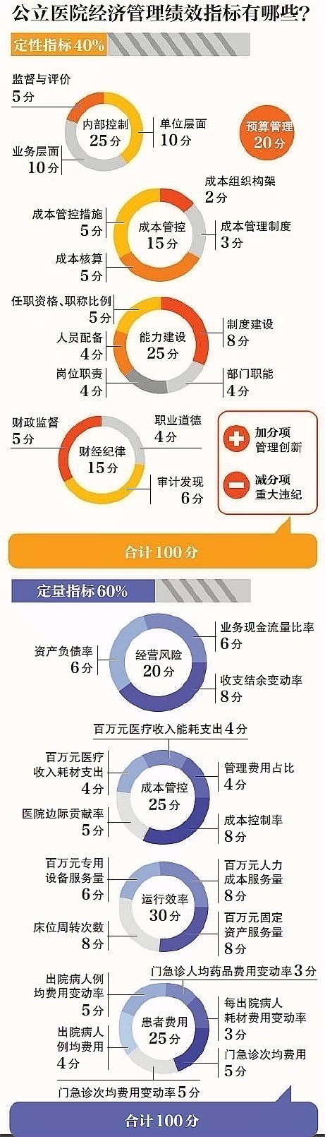 根據規定,考評的指標體系分為定性考核與定量考核。定性考核按年度進行,主要考核醫院經濟管理過程,包括預算管理、成本管控等,定量考核則反映醫院經濟運行結果狀況,按月監測、按年考評。