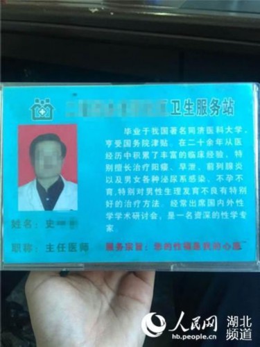 據了解,2009年初,無正當職業的天門市人史牡仿化名“史中梁”,標榜自己是北京某著名醫院生殖泌尿系主任醫師、性功能障礙學國務院特殊成就獲得者、前列腺疾病學資深專家,來到十堰市茅箭區二堰街辦老街社區衛生服務站中醫科坐診行醫,并以治療男性病為名大肆銷售假藥,不到6年時間共有600余人服用假藥受騙。