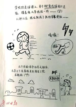 南方醫科大學第三附屬醫院關節外科、運動醫學科副主任曾春及科里的其他醫生護士,最近收到了一份特別的“感謝信”——一組手繪漫畫,是由他主刀手術的一位髕骨脫位的大二女生,在本月中旬回醫院拆線時送來的。受傷過程、就醫過程、住院流程、手術前后的心情、病房的氛圍等,都成了這位女生手繪漫畫的素材,滿滿的都是溫馨與幽默。