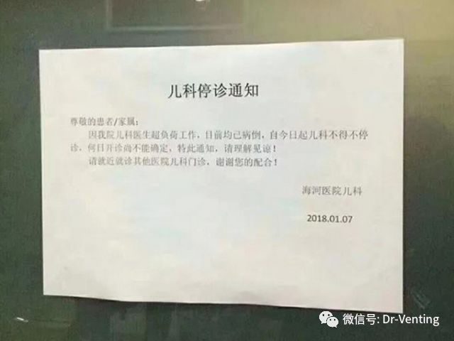 1月8日,天津市海河醫院就張貼了通知,表示該科的三名兒科醫生由于超負荷工作,已經全部病倒,其中一位醫生也是因為得了流感,并傳染給了全家。因此兒科不得不停診,何時開展尚不能確定。