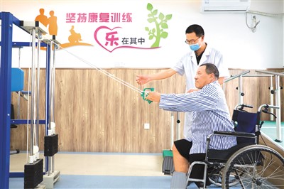 圖為7月3日,在河南省焦作市溫縣祥云鎮醫養中心,入住人員在醫生指導下進行康復鍛煉。