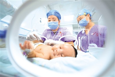 圖為8月19日,在貴州省丹寨縣人民醫院新生兒科病房,醫生在為新生兒換藥。