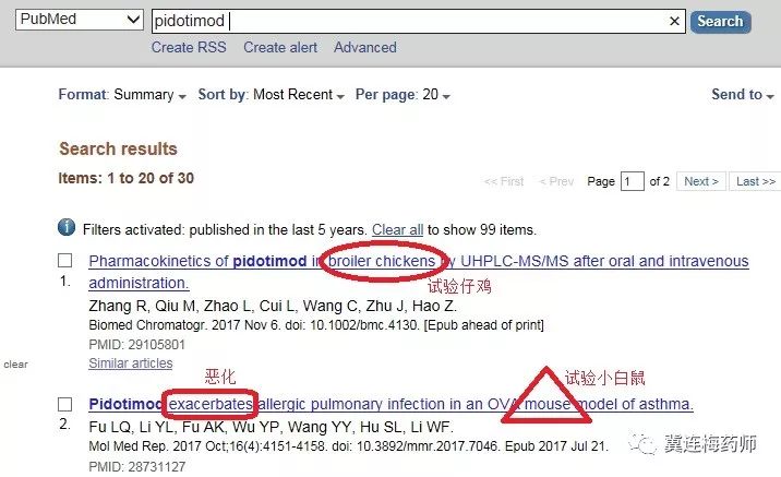這個藥1993年首次在意大利上市,距今已經有24年的臨床使用歷史,按理說應該有相當多的臨床研究。可是打開Pubmed網站,用匹多莫德的英文藥名Pedotimod作為關鍵詞進行檢索,僅搜索出99篇相關文獻,研究者主要集中在中國和極少數幾個歐洲國家如意大利、俄羅斯。排在最前面的兩篇新出版文章就是咱們中國同行的文章,可惜還停留在臨床前的動物研究階段,不是仔雞就是小白鼠,對臨床沒有實際指導意義。