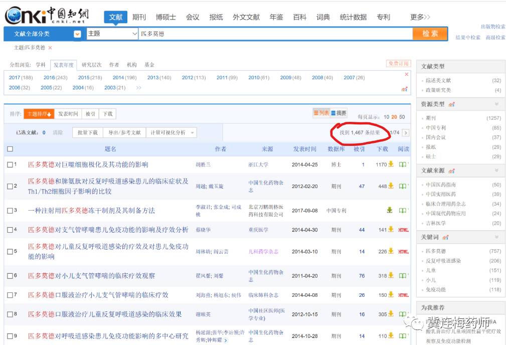 檢索國外的數據庫無功而返,我又轉戰國內數據庫,輸入關鍵詞,一點搜索鍵,結果驚呆了!光是CNKI數據庫就彈出1400+條文獻,其中不乏許多核心期刊,可見匹多莫德在中國的受歡迎程度!