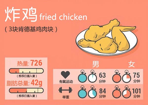 首先是“來自星星的炸雞”。3塊炸雞塊就有726卡路里,如果不想長肥肉,女人要做1小時15分鐘的有氧運動或半個多小時的舉重練習。