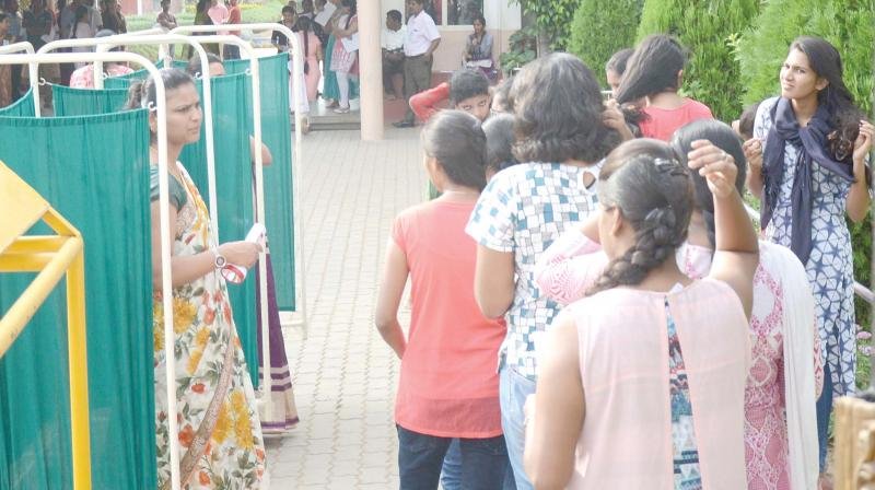 據(jù)《每日郵報(bào)》報(bào)道,當(dāng)?shù)貢r(shí)間5月7日,來自印度城市坎努爾的18歲女生魯帕在接受考試之前的安檢時(shí),被要求當(dāng)眾脫下文胸,以排除作弊嫌疑。魯帕深覺受到了侮辱,在考試之前遭遇此事也給她帶來了極大的心理壓力,影響了她的考試發(fā)揮。圖為學(xué)生們在考試之前接受檢查。
