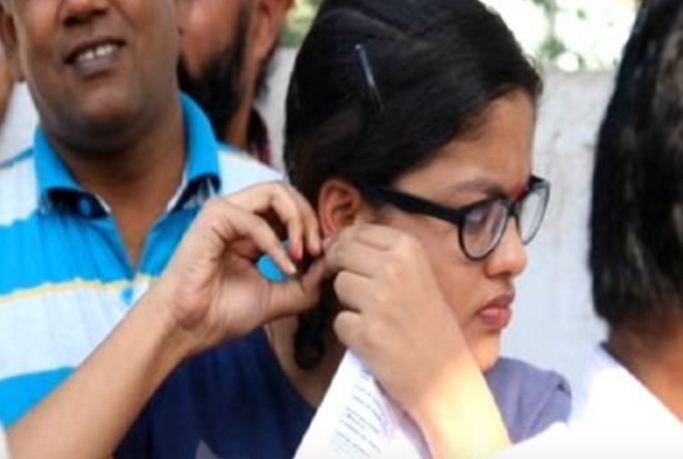2015年7月,印度曝出一場大型作弊丑聞,超過700名學(xué)生依靠監(jiān)聽設(shè)備作弊。從此以后,印度出臺了一系列加強(qiáng)考場安檢的措施。目前,在印度,班加羅爾的考試委員會會在考場提供短袖T恤給那些衣著不符合要求的學(xué)生更換;有些地方的考生則需要光腳答題;更多情況下,女生們會被要求在考試之前脫下耳環(huán)并摘下其他的鈕針。圖為一名女生在接受考場檢查時(shí)摘下耳釘。