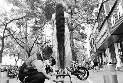 由于頭發長度遠超身高,這名女士在梳理頭發時,左手得將頭發托起,否則會落在地上。烏黑發亮的頭發總會讓不少路過的市民駐足觀看,羨慕不已。