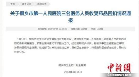 由于內(nèi)容的敏感度,該爆料也引起了當(dāng)?shù)卣块T的重視。16日,在當(dāng)?shù)卣?wù)網(wǎng)上,桐鄉(xiāng)市衛(wèi)生和計(jì)劃生育局發(fā)布了關(guān)于桐鄉(xiāng)市第一人民醫(yī)院三名醫(yī)務(wù)人員收受藥品回扣情況通報(bào)。通報(bào)內(nèi)容如下:1月16日,桐鄉(xiāng)市衛(wèi)生和計(jì)劃生育局召開專題會(huì)議,通報(bào)桐鄉(xiāng)市第一人民醫(yī)院三名醫(yī)務(wù)人員收受藥品回扣最新調(diào)查情況,部署全面排查和專項(xiàng)整治工作。經(jīng)過前期初步核實(shí),目前涉事的三名醫(yī)生已停職,涉及藥品已停止使用。紀(jì)檢部門對(duì)其黨紀(jì)政紀(jì)立案,目前正在審查中,待調(diào)查取證全部完成后,及時(shí)向社會(huì)公布。