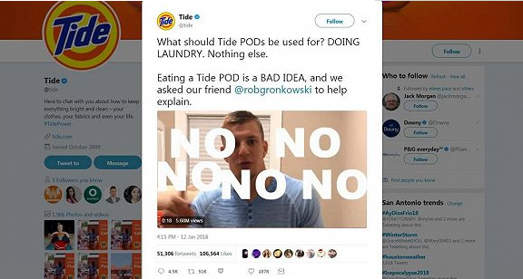 五天前,汰漬和YouTube及Facebook達成了協議,刪除平臺上”汰漬挑戰“的內容。同時請來頗有影響力的美國職業橄欖球聯盟的運動員Rob Gronkowski,錄制了一段強調食用洗衣球危害的視頻。