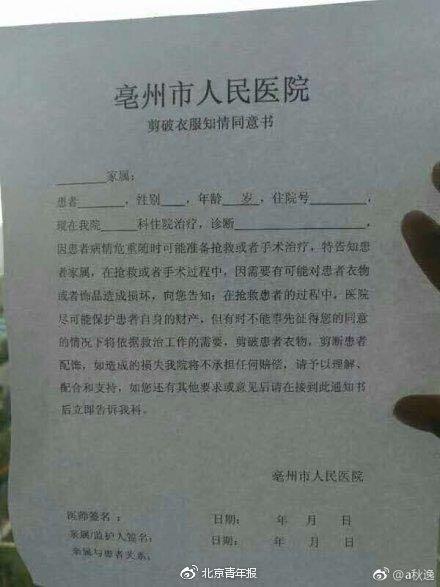 9月23日,有網友在微博發帖稱,亳州市人民醫院制作了一份“剪破衣服知情同意書”,并稱該同意書需要患者住院期間由家屬簽訂。知情同意書內容包括患者個人信息以及醫師和家屬簽字等內容,該知情同意書中提到“在搶救或者手術過程中,因需要有可能對患者衣物或者飾品造成損壞,向您告知:……有時不能事先征得您的同意的情況下將依據救治工作的需要,剪破患者衣物,剪斷患者配飾,如造成的損失我院將不承擔任何賠償……“