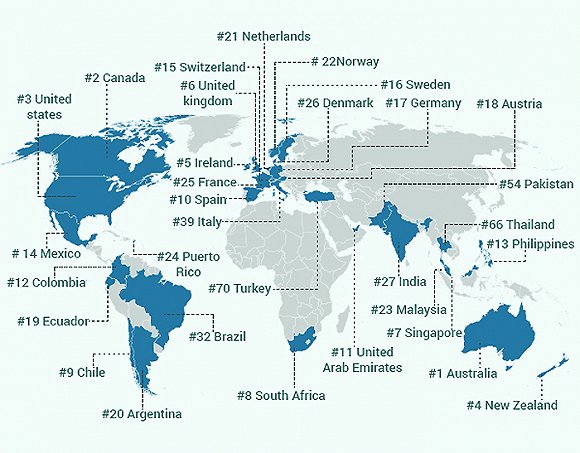 按照以上條件得出的研究結果如下圖??梢钥吹剑瑢】涤^念最有興趣的前10個國家是:澳大利亞、加拿大、美國、新西蘭、愛爾蘭、英國、新加坡、南非、智利、西班牙。對健康觀念興趣最低的10個國家則包括(排名從后往前):尼泊爾、孟加拉國、巴林、敘利亞、波黑、阿曼、斯里蘭卡、卡塔爾、突尼斯、伊拉克。