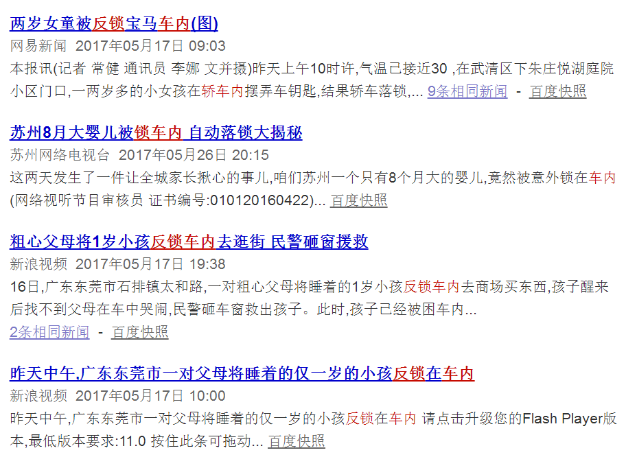 美國得克薩斯州派克郡一名2歲女童和她16個月大的弟弟近日被鎖在一輛停在戶外的汽車內,因高溫而死亡。自1998年以來,全美已有709名兒童喪生于炎熱的汽車內。而在中國,粗心父母將孩子反鎖在車內,導致孩子喪命的事件也屢見不鮮。