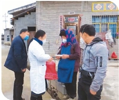 2020年疫情期間,潘鳳(左二)給群眾發(fā)放藥物。