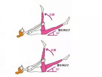 平躺,右腳舉成90度,左腳保持30度的姿勢。雙手要抱住90度的腳,手腳伸直,背部也要伸直,一個動作維持30秒,然后換過來再做一遍。可以訓(xùn)練到腹部的肌肉,大腿的肌肉也能得到很好的伸展。
