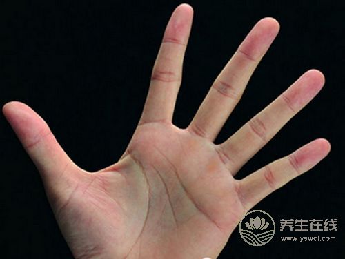 2、櫻桃紅掌色:掌色是櫻桃紅的,并且集中在十指腹部和大小魚際邊緣的就要注意檢查血糖和尿糖了。