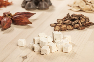 茯苓中的主要成分為茯苓聚糖,含量很高。對多種細菌有抑制作用;能降胃酸,對消化道潰瘍有預防效果;對肝損傷有明顯的保護作用等。
