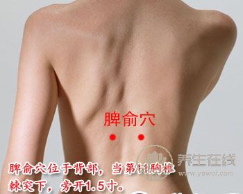 1.脾俞穴:位于背部,和肚臍對應位置的脊柱,上3個脊椎下,旁開2橫指處。