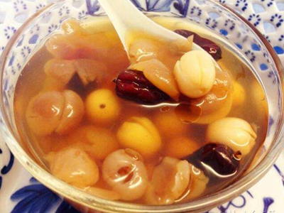 準備:蓮子、桂圓肉各30克,紅棗20克,冰糖適量