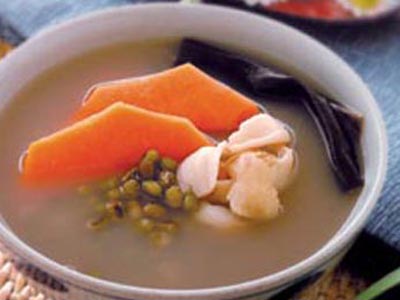 木瓜半個,海帶50克,烏雞半只,黨參2只。做法:木瓜除子去皮,海帶洗凈切塊,烏雞剁成小塊,放入鍋中加水文火慢燉,2小時后出鍋,加食鹽4克。功效:這道湯以木瓜、海帶理氣散結,以烏雞滋補肝腎,黨參補氣以助木瓜理氣之功。