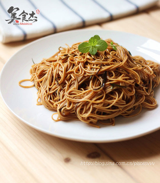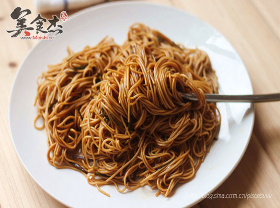 7.面條煮熟后,放入冰水中投涼,撈出,加入兩勺蔥油汁,拌勻開