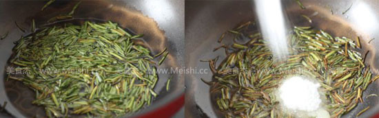 4.待鍋中的蔥段變黃,倒入細砂糖