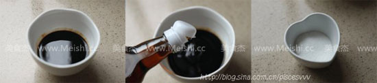 3.熬制蔥油的間隙,將生抽和老抽倒入碗中混合,滴入少許魚露,準備好細砂糖