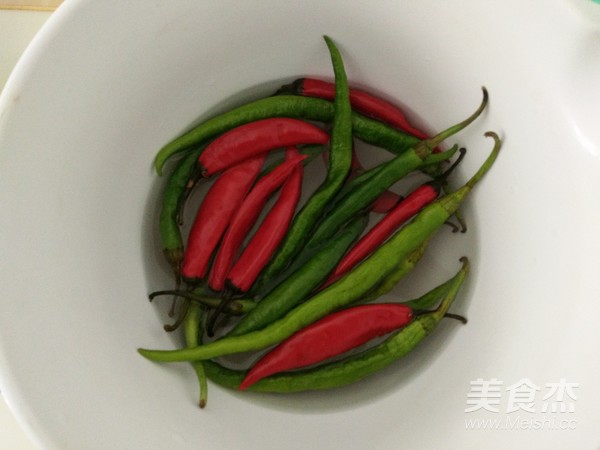 青紅辣椒用鹽水浸泡5分鐘后洗凈。