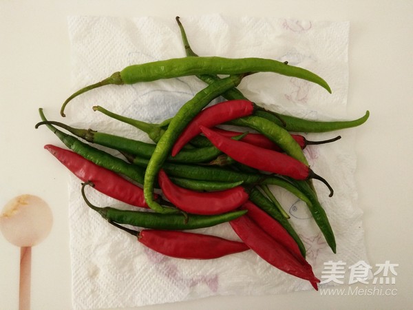 用廚房紙巾吸去辣椒上的水分。