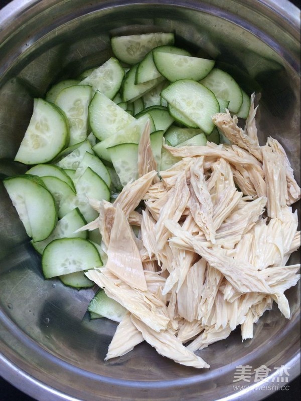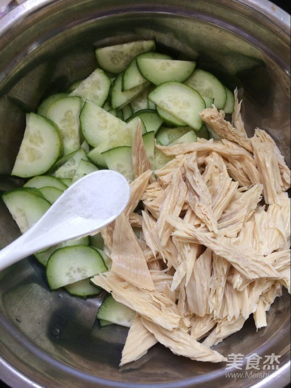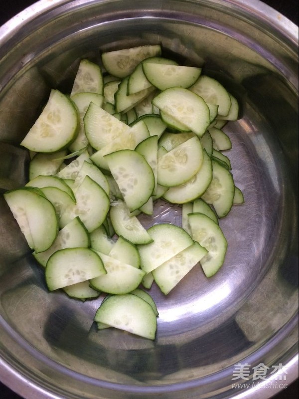 將切好的黃瓜片放入盆中。