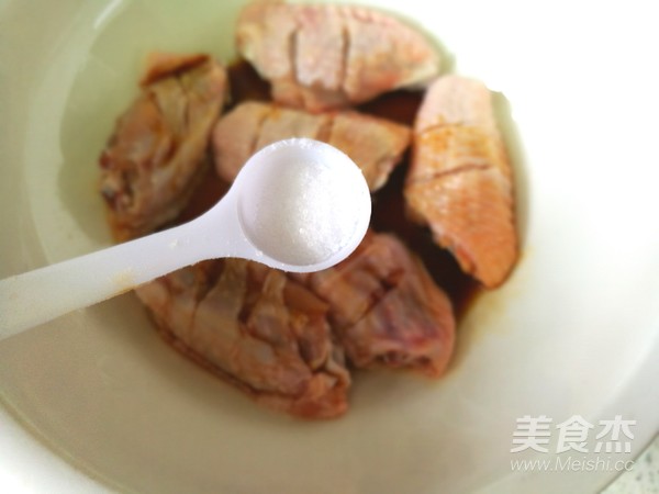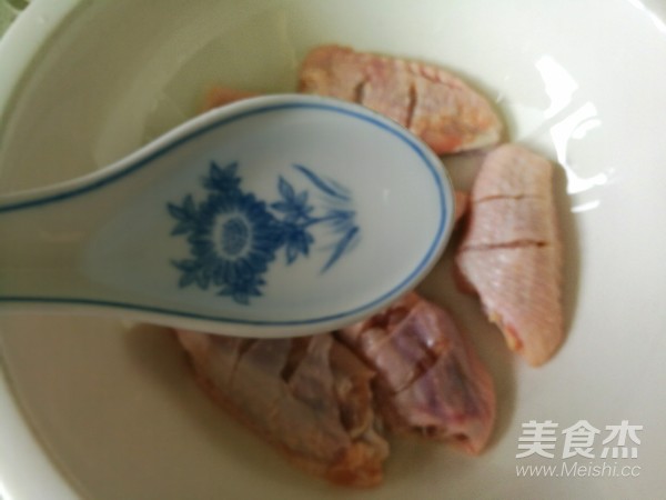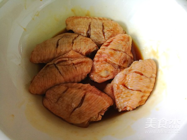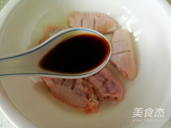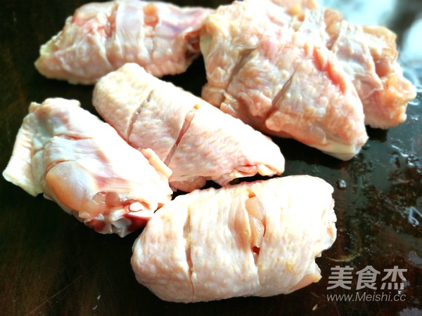 雞翅洗干凈,用刀在雞翅正反兩面斜劃兩刀,方便入味。