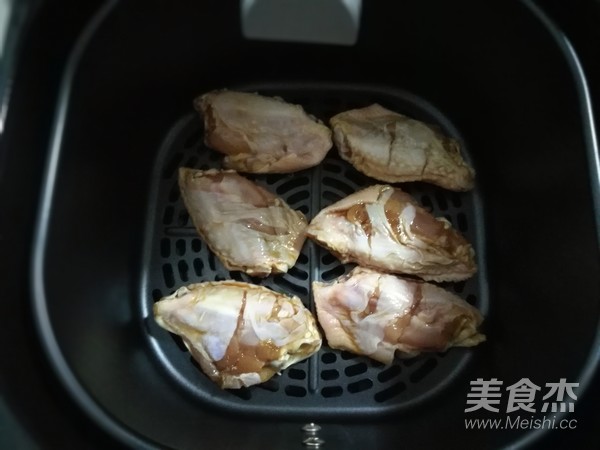 空氣炸鍋提前200度預熱5分鐘,將腌好的雞翅平鋪在炸籃里,設置20分鐘。