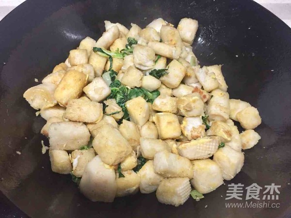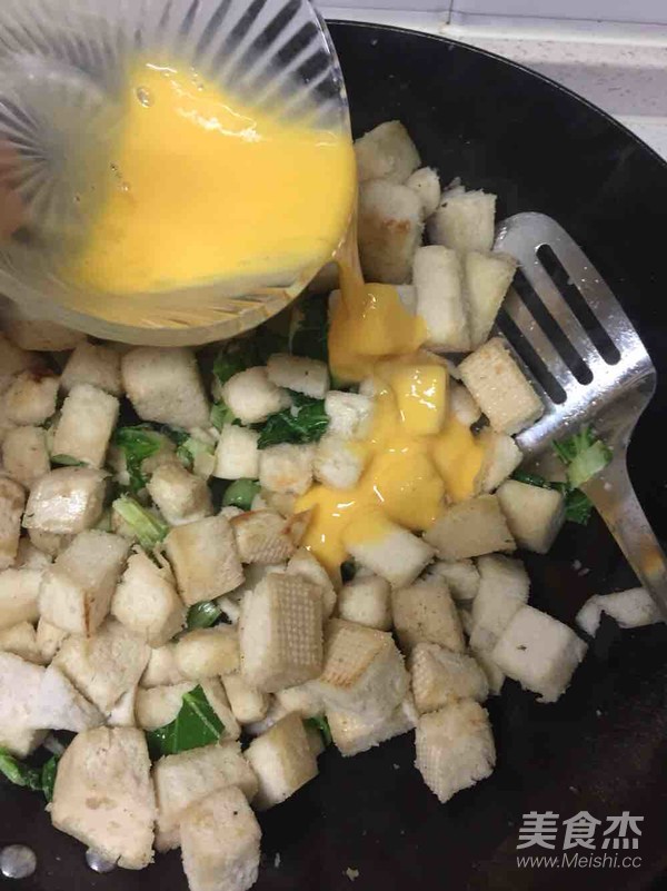 5.3.待小白菜稍軟,放入饅頭、適量鹽、少許雞精、少許十三香,繼續翻炒。