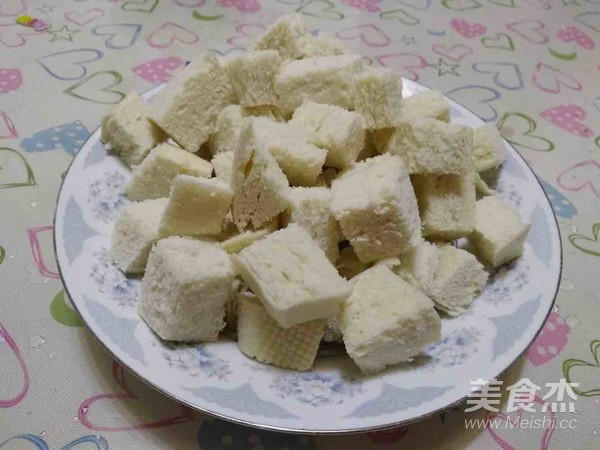 4.饅頭切好之后,盆里放一點點水,盆底濕濕的就行,把饅頭放入盆中晃動,只要上面的大粒饅頭,饅頭渣就會留在下面。