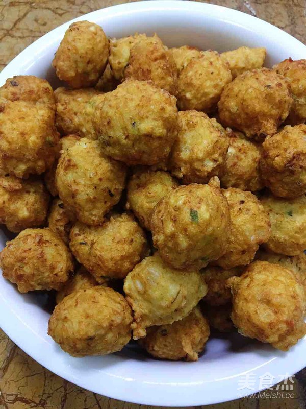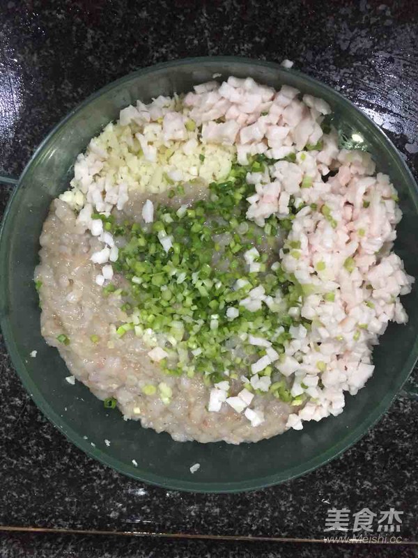 蔥白切碎,肥豬肉切顆粒狀,加鹽,然后所有材料混在一起攪拌……加入面粉和一只雞蛋攪拌均勻,準備一碗清湯和一個勺子。用手擠出一個個丸子,中小火慢慢炸熟。滿滿都是蝦肉的蝦丸就完成啦!