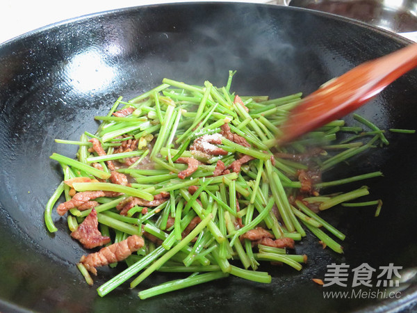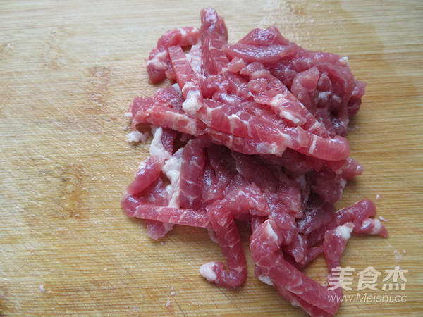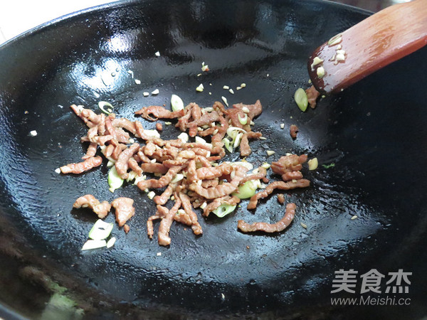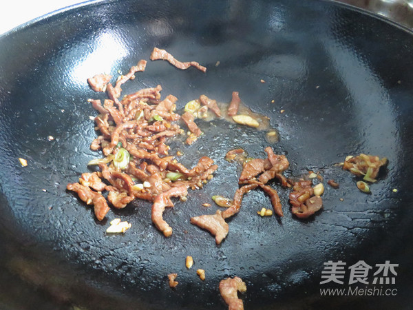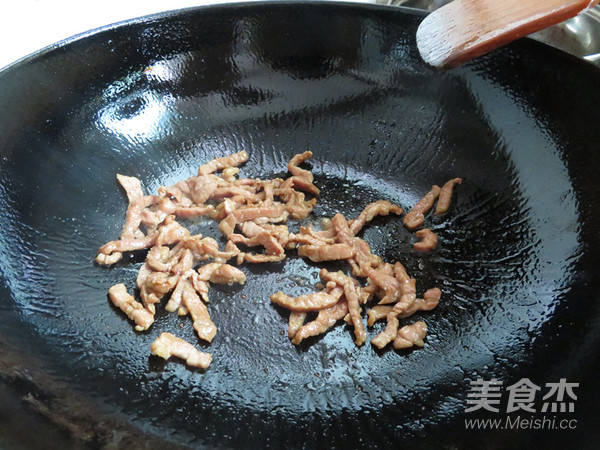 鍋中加油燒熱后放入肉絲煸炒至變色斷生