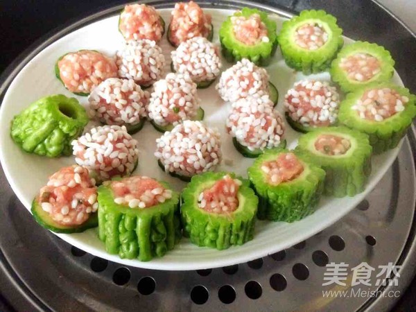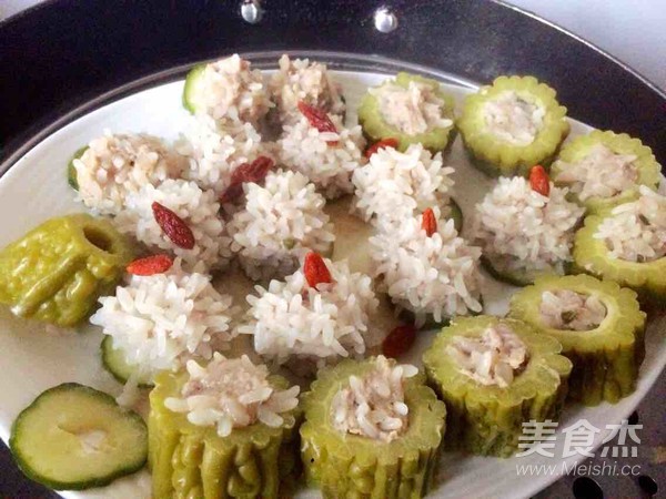 5.我做的丸子少點(diǎn),人口不多,又加了苦瓜,做的苦瓜釀,把洗好的枸杞可以放在丸子上,裝飾。鍋里水開了,就放下去蒸,先大火燒三分鐘,之后中小火,關(guān)火再悶一會(huì)。