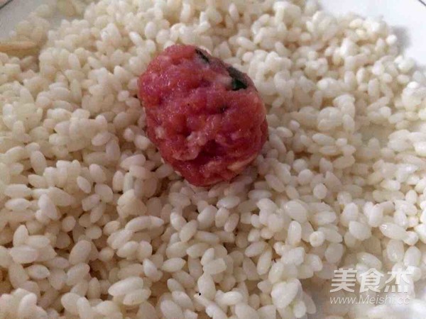 2.將肉餡捏成圓子,放在濾干水的江米上,