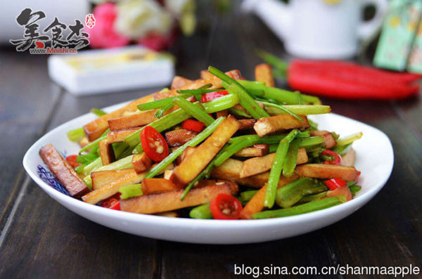 1.準(zhǔn)備食材:香芹、豆腐干、紅尖椒等