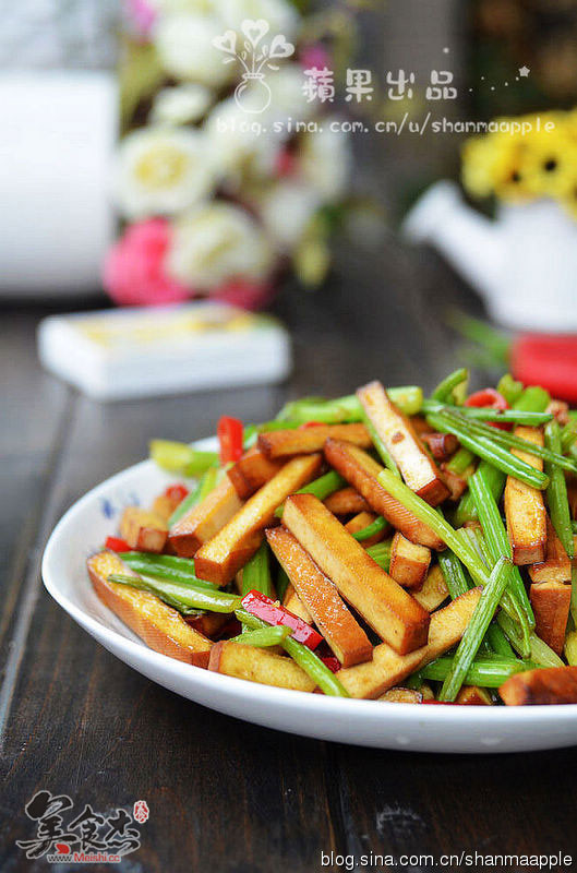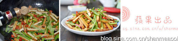 2.香芹去掉葉子洗干凈切段,香干切成條、紅尖椒切圈