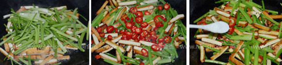 5.香芹稍炒軟時(shí)放入紅尖椒