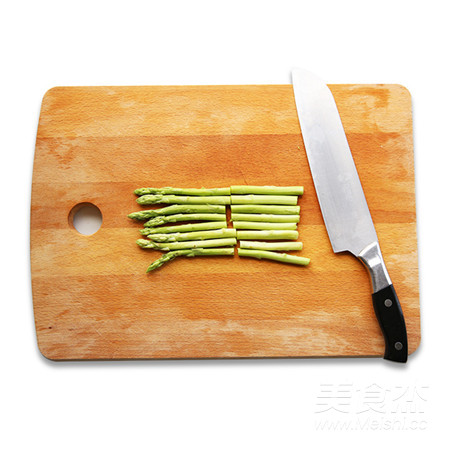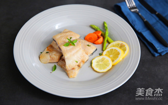 將蘆筍和紅蘿卜焯水后擺盤上,放上沙巴魚、羅勒葉和檸檬片即可。