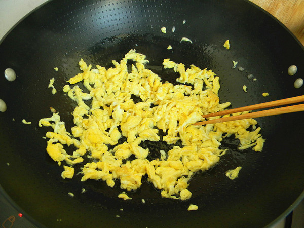 炒鍋熱油,油溫燒高一點的時候倒入打散的雞蛋,迅速用筷子攪拌,這樣雞蛋很容易攪散大火,改小火在把雞蛋煎2分鐘,這樣的雞蛋金黃包餡才好吃
