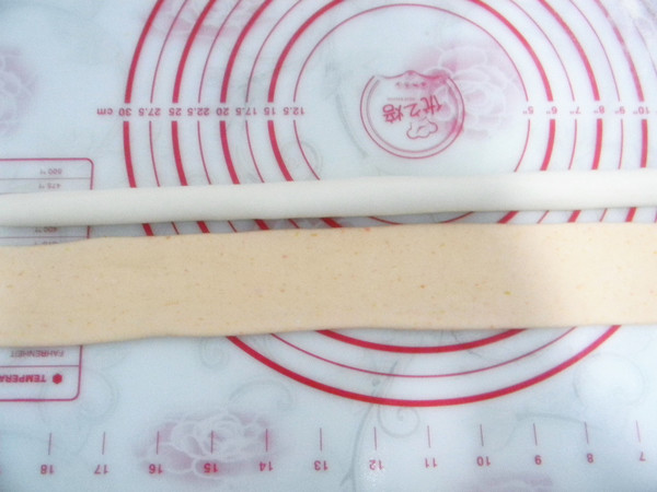 9.取出餳好的面團。白面團搓成細條狀,胡蘿卜面團搓成細條狀后,在搟成片狀,寬度大于白面團的圓柱周長