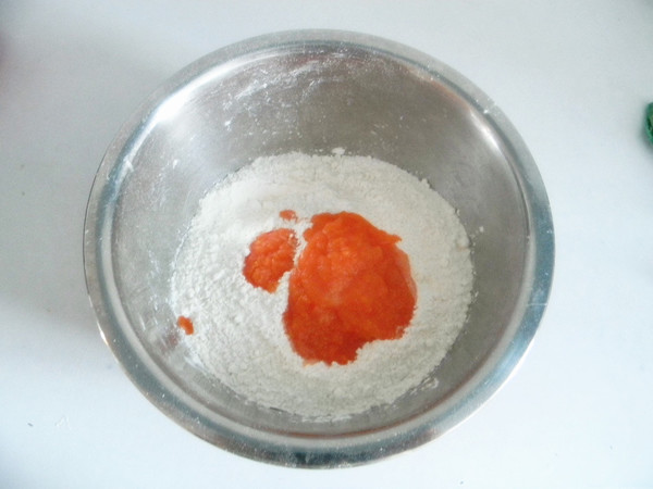 2.攪打好的胡蘿卜泥倒入一半的面粉里