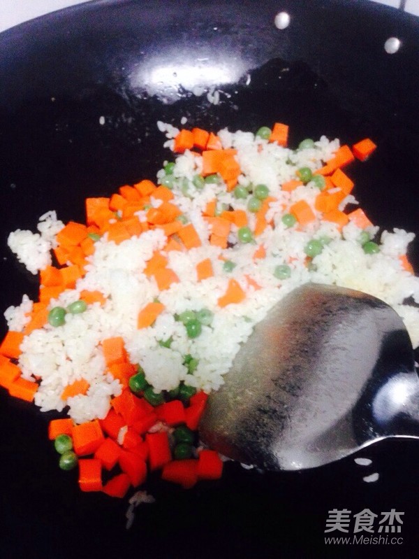 加入胡蘿卜和豌豆炒至米飯熱透