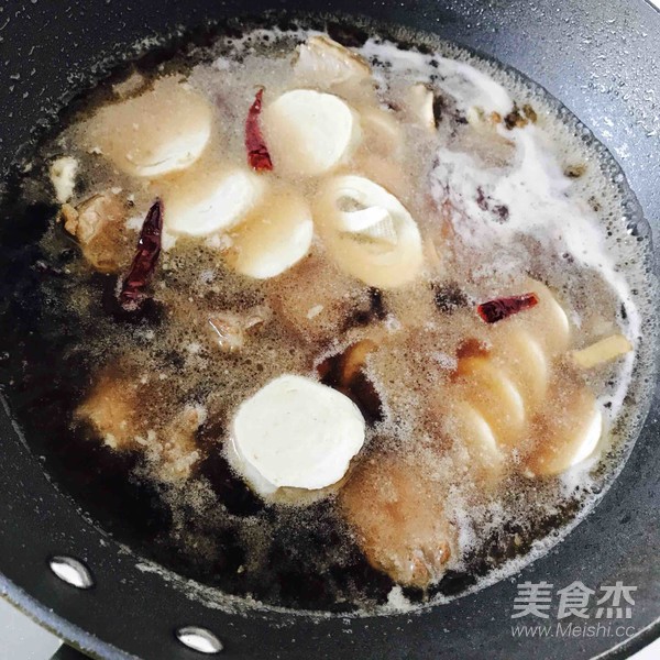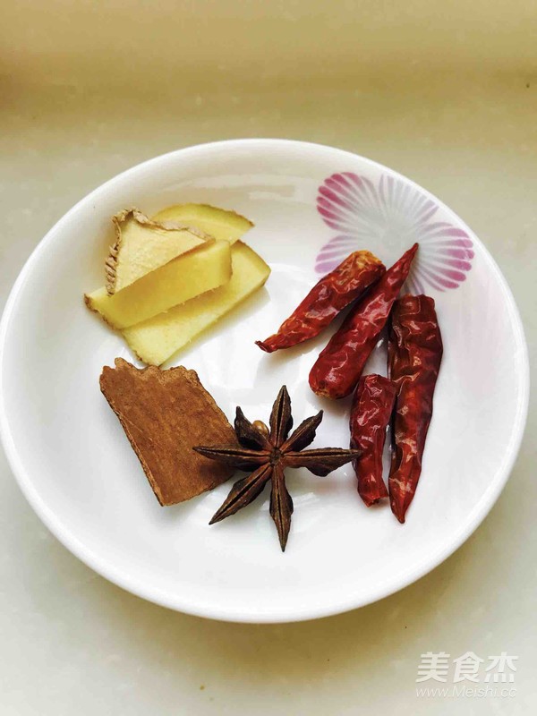 排骨煸炒變色后,淋上白酒1小勺繼續煸炒,淋3滴白酒,放入干辣椒、八角、桂皮,爆香