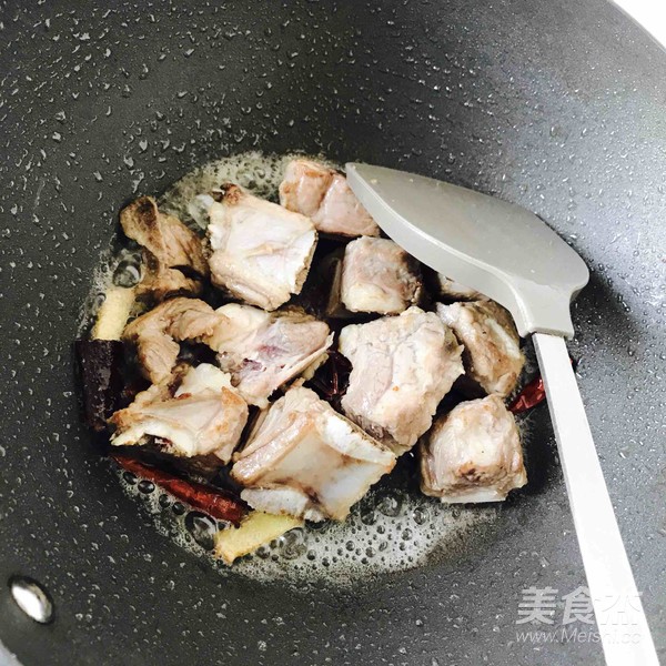 鍋里倒入少許油,熱鍋下姜熗鍋,下排骨煸炒
