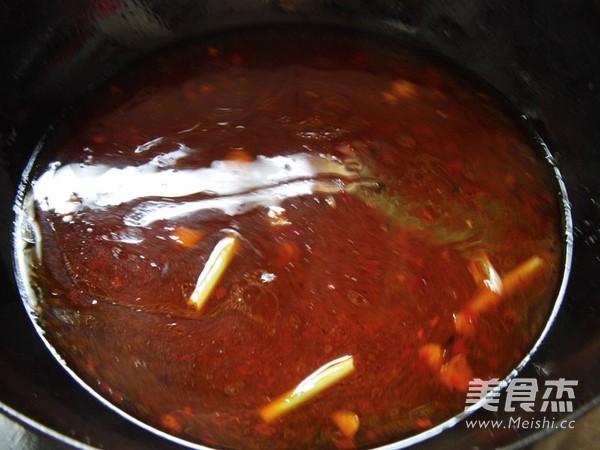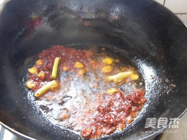 炒鍋放入2湯匙菜籽油加入豆瓣醬、姜末、蔥段炒出紅油